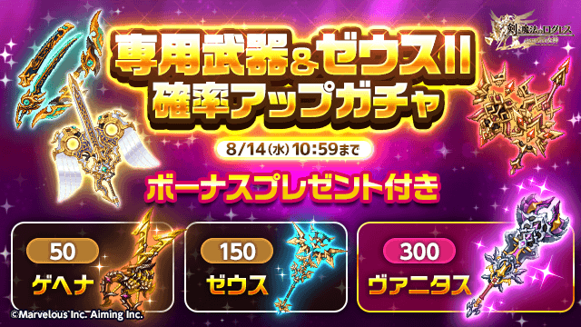 専用武器とゼウスⅡが確率アップした本ガチャでは、50回目のボーナスで「ゲヘナの魔神器」が、300回目のボーナスで「ヴァニタス」がもらえるチケットが手に入ります!