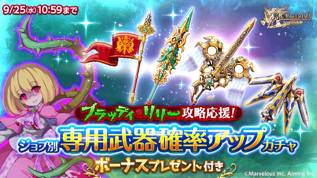 期間中、ガチャの「オススメ」タブにてブラッディリリー攻略応援として「ジョブ別専用武器確率アップガチャ」を販売します。