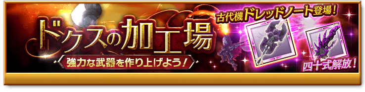 2019/11/20(水)のメンテナンスにて、「ドクスの加工場」で製作可能な武器に「古代機ドレッドノート」を追加しました。