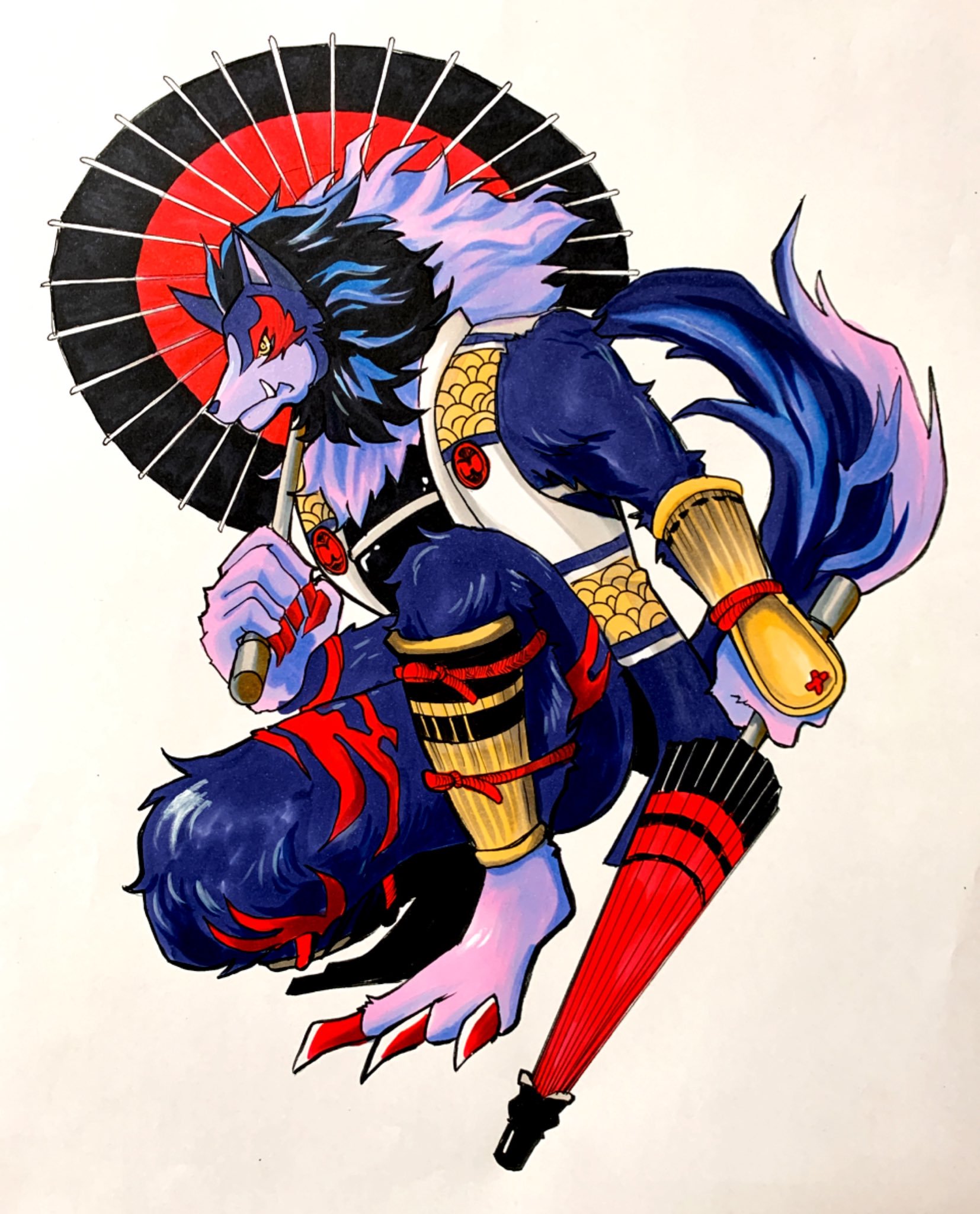 アサシンウルフ懐かしいですね! フィニッシュブローの「ブラッディレイン」を放ち降らせた血の雨から番傘で身を守る・・・そんな姿を想像してしまいました! クールな格好良さを表現したデザインとなっていて素敵だと思いました! |