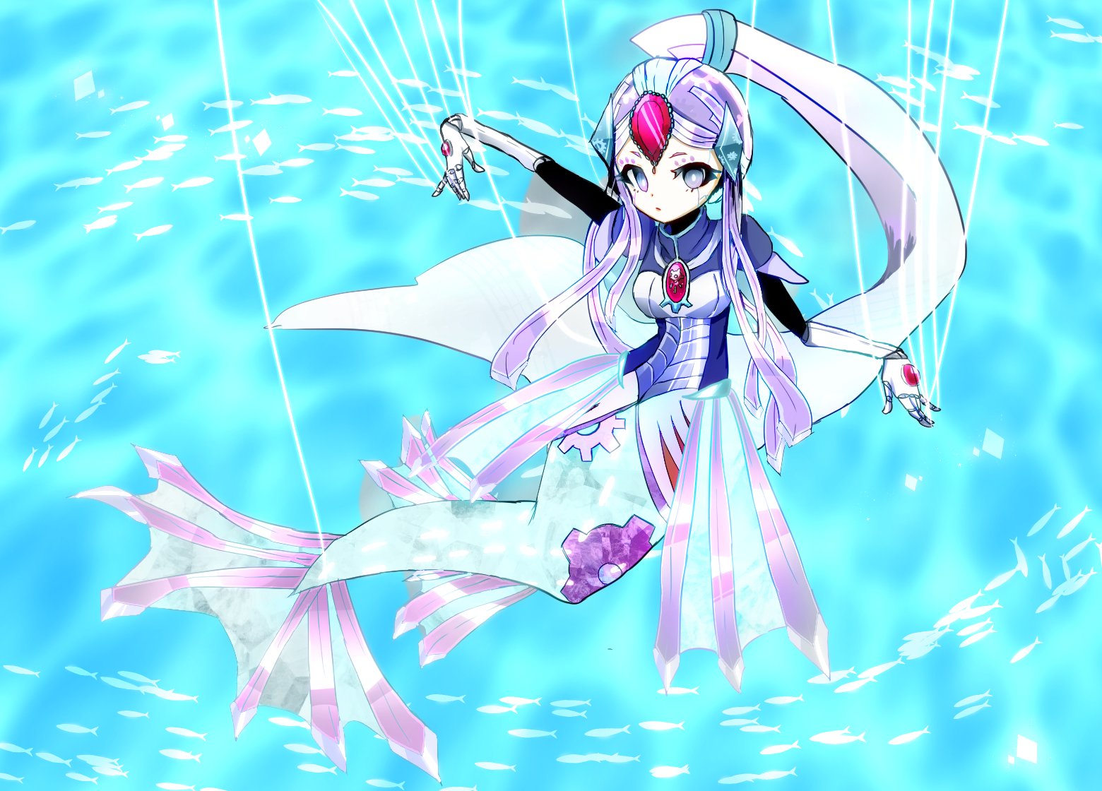 「糸に吊られた機械仕掛けの人魚」という斬新なアイディアと、配色の美しさが際立つ作品です。 メインビジュアルだけでなく、顔の造形などディテールのデザインも考えられている点が素晴らしいです。 可憐なイラストと対象的に、これから始まる激しい戦闘を予感させる意気込みを書いていただいた点も面白いと思います! |