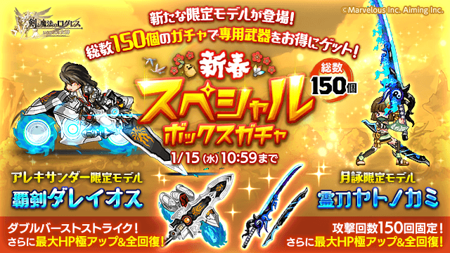 期間中、ガチャの「オススメ」タブにて「覇剣ダレイオス 新春スペシャルボックスガチャ」と「霊刀ヤトノカミ 新春スペシャルボックスガチャ」を販売します。