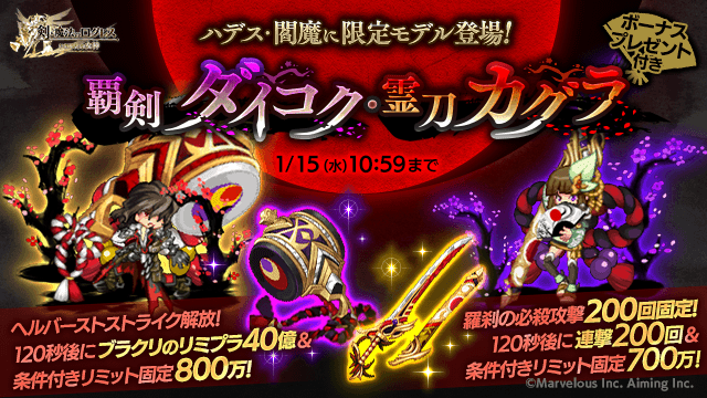 期間中、ガチャの「オススメ」タブにて、ハデス限定モデル「覇剣ダイコク デスペラードガチャ」と閻魔限定モデル「霊刀カグラ アサシンガチャ」を販売します。