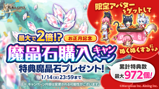 お正月記念!期間中の魔晶石購入の合計金額に応じ、特典魔晶石や限定アバターがもらえるキャンペーンを開催します。