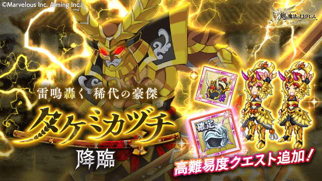 期間中、「ログレス」タブのスペシャルクエストおよび時限イベントにて「『タケミカヅチ』降臨」を開催します。