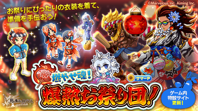期間中、「ログレス」タブのスペシャルクエストおよび時限イベントにて「燃やせ魂!爆熱お祭り団!」を開催します。