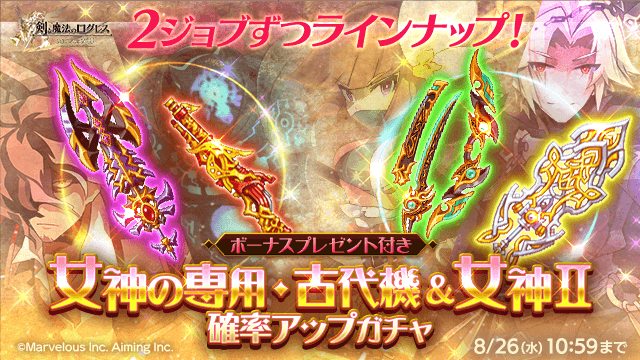 「女神の専用武器・古代機」と「女神の魔神器Ⅱ」がシリーズ毎に確率アップ!