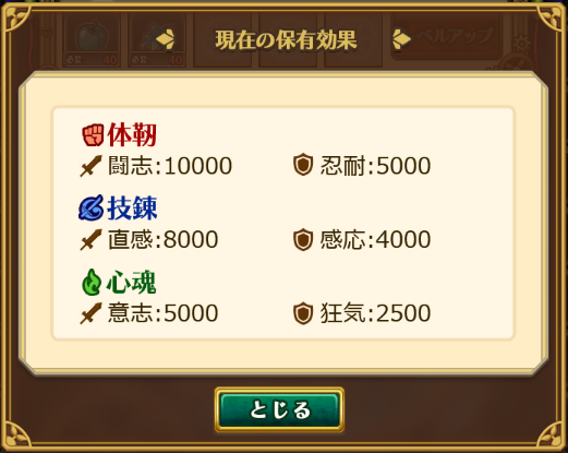 「体靭」「技練」「心魂」のステータスがあり、さらにその中で攻撃/防御の2つに分かれます。