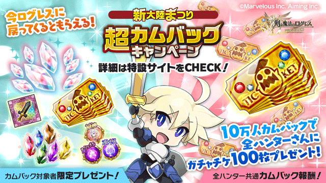 今ログレスに戻ってくると、魔晶石30個や「新大陸記念ガチャチケット」50枚などのカムバック対象者限定プレゼントがもらえる!