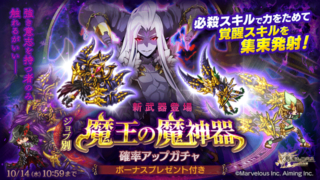 期間中、ガチャの「オススメ」タブにて「ジョブ別 魔王の魔神器確率アップガチャ」を販売します。