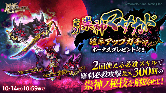 期間中、ガチャの「オススメ」タブにて「霊刀祟神マサカド確率アップガチャ」を販売します。