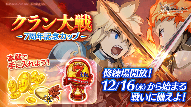 2020/12/16(水)より、クラン大戦「7周年記念カップ」の開催が決定!来る本戦に向けて、「ログレス修練場」で戦いに備えよう!