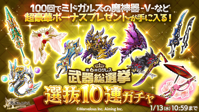 期間中、ガチャの「オススメ」タブにて「第6回ログレス武器総選挙」で上位120位までに選ばれた武器のみが手に入る「選抜10連ガチャ」を販売します。