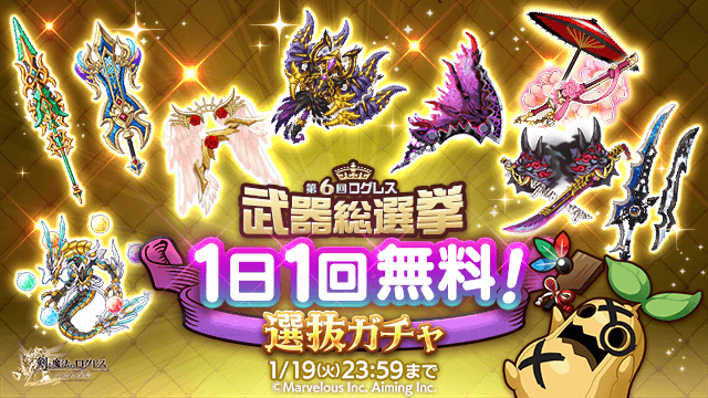 「第6回ログレス武器総選挙」にて上位120位に選ばれた武器のみが「選抜10連ガチャ」と同じ確率で排出!