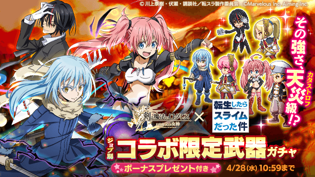 ボーナスプレゼント付きのガチャで今しか手に入らないコラボ限定武器を手に入れて、リムルたちと共に戦おう!