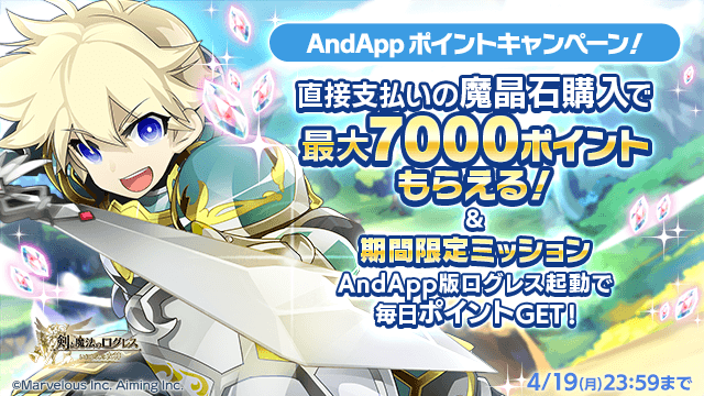 AndApp版「剣と魔法のログレス いにしえの女神」にて、「直接支払い」でお支払い頂くことで、期間中の合計購入金額帯に対応したAndAppポイントをプレゼント!