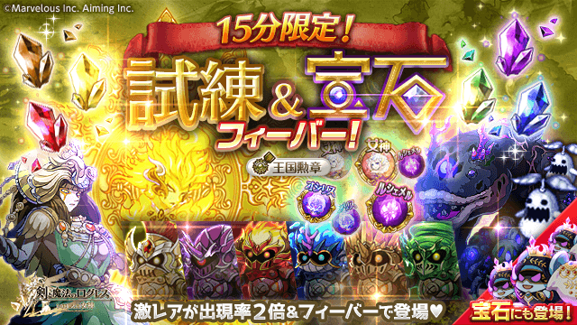 期間中、「ログレス」および「ルシェメル」タブの時限イベントにて、「属性の試練」「宝石の守護神」の各クエストで大量の素材が手に入るフィーバータイムを開催します。