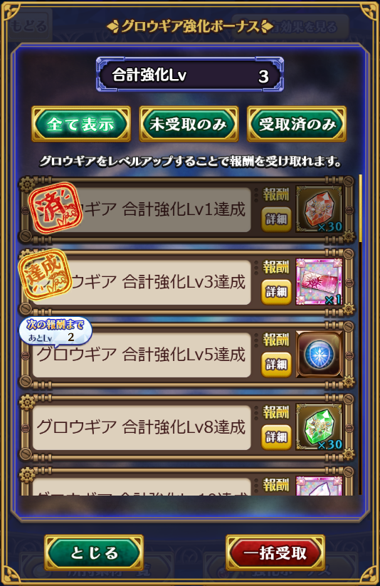 グロウギアの合計強化Lvに応じて、新武器「晶龍」やキャラアビリティ、補助枠(アクセ)などの豪華報酬を獲得できるようになりました。