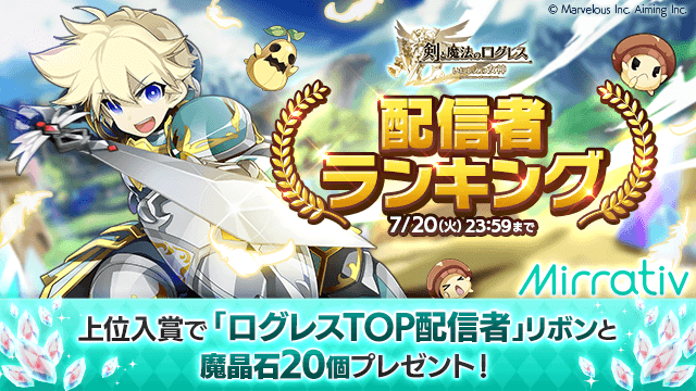 Mirrativでログレスの配信を行い30位までに入賞すると、魔晶石20個とMirrativで表示される特別なリボン「2021.7 ログレスTOP配信者」をプレゼント!
