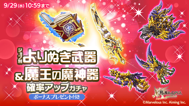 期間中、ガチャの「オススメ」タブにて「ジョブ別 よりぬき武器&魔王の魔神器確率アップガチャ」を販売します。
