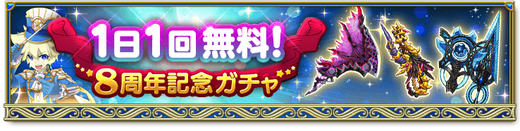 期間中、ガチャの「オススメ」タブにて、1日1回無料で利用することができる「1日1回無料!8周年記念ガチャ」を実施します。