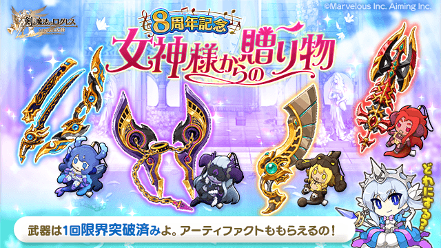 女神様から、1回限界突破済みの「女神の専用武器・古代機」と選んだ武器に装着するアーティファクトを授かろう!