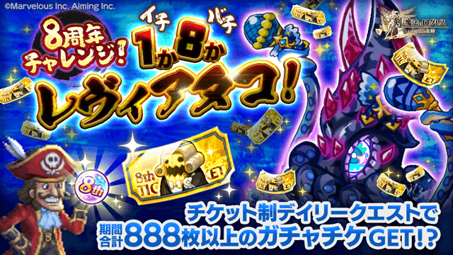 合計888枚以上のガチャチケが手に入るかも!?「8周年チャレンジ!1か8かレヴィアタコ!」