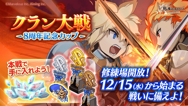 2021/12/15(水)より、クラン大戦「8周年記念カップ」の開催が決定!来る本戦に向けて、「ログレス修練場」で戦いに備えよう!