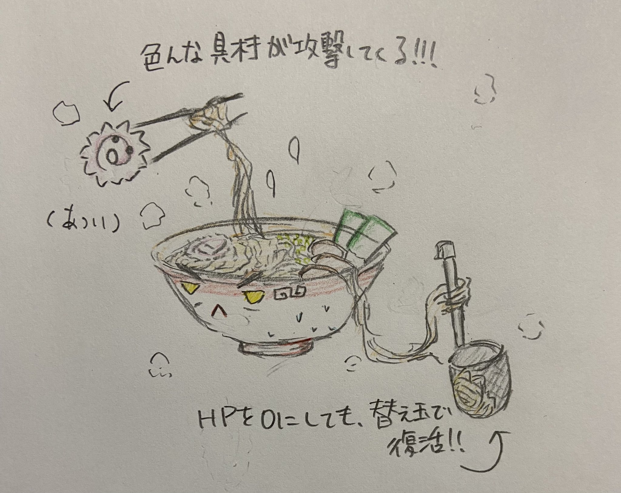 戦ってるとお腹が空いてきそうだYO! 替え玉で復活がいいNE! |