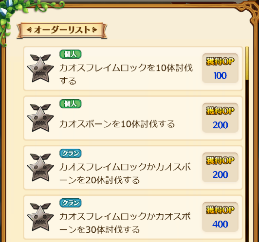 オーダーには、個人でチャレンジするものとクランメンバーと協力するものの2種類があり、内容によって獲得できるOPも異なります。