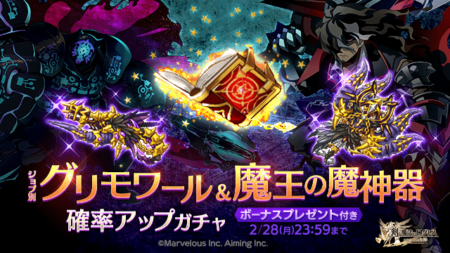 武器と同属性魔神器の必殺攻撃スキル効果を一度だけ爆発的に強化する「グリモワールの専用武器・古代機」と、超火力を叩き出す覚醒スキル「集束発射」が魅力の「魔王の魔神器」をシリーズごとに確率アップ!