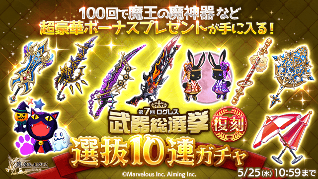 期間中、ガチャの「オススメ」タブにて「第7回ログレス武器総選挙」で上位120位までに選ばれた武器のみが手に入る「選抜10連ガチャ」を販売します。