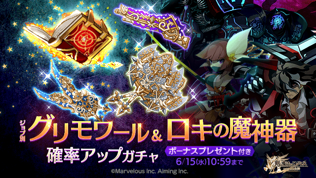武器と同属性魔神器の必殺攻撃スキルを一度だけ爆発的に強化する「グリモワールの専用武器・古代機」と、マナに応じた追加効果&効果が大きく異なる伝説/英雄スキルが魅力の「ロキの魔神器」をシリーズごとに確率アップ!