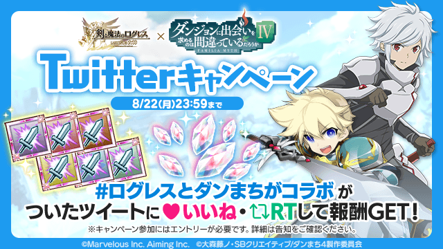 期間中、『ダンジョンに出会いを求めるのは間違っているだろうかⅣ』とのコラボを記念して「ログレス×ダンまちIVコラボTwitterキャンペーン」を実施します。