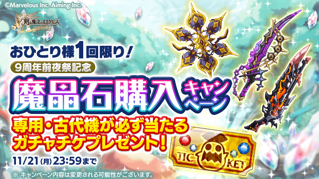 9周年前夜祭記念!魔晶石の合計購入金額が特定金額に達することで、専用武器・古代機が必ず当たるチケットがもらえるキャンペーンを開催します。