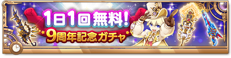 期間中、ガチャの「オススメ」タブにて、1日1回無料で利用することができる「1日1回無料!9周年記念ガチャ」を実施します。