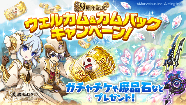 今ログレスを始めるor戻ってくると、魔晶石50個や「9周年記念ガチャチケット」100枚、「アナザーコスモ(MB2)-轟器、妖刀-チケット」の対象者限定プレゼントがもらえます!