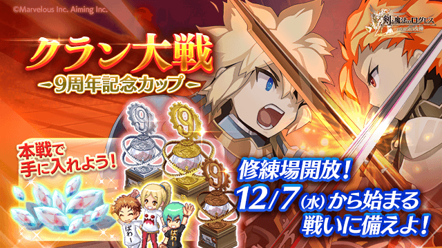 2022/12/7(水)より、クラン大戦「9周年記念カップ」の開催が決定!来る本戦に向けて、「ログレス修練場」で戦いに備えよう!