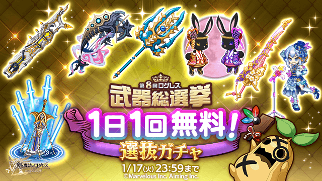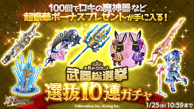 「第8回ログレス武器総選挙」にて上位120位に選ばれた武器のみが「選抜10連ガチャ」と同じ確率で排出!