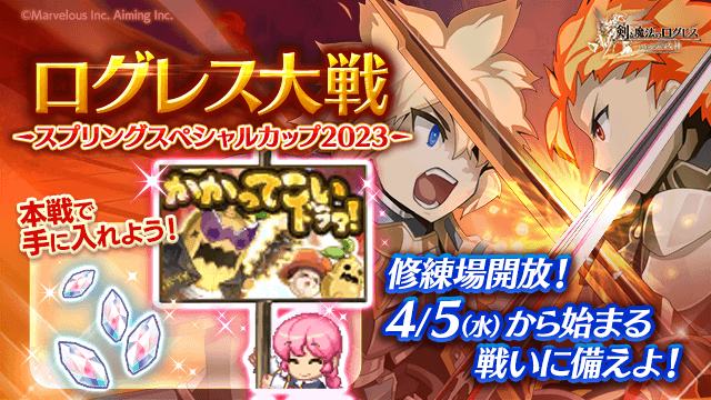 2023/4/5(水)23:00より、ログレス大戦「スプリングスペシャルカップ2023」の開催が決定!来る本戦に向けて、「ログレス修練場」で戦いに備えよう!