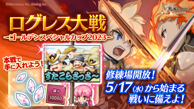2023/5/17(水)22:00より、ログレス大戦「ゴールデンスペシャルカップ2023」の開催が決定!来る本戦に向けて、「ログレス修練場」で戦いに備えよう!