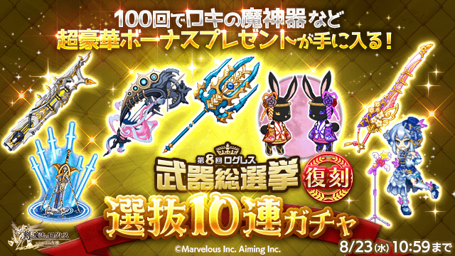 期間中、ガチャの「オススメ」タブにて「第8回ログレス武器総選挙」で上位120位までに選ばれた武器のみが手に入る「選抜10連ガチャ」を販売します。