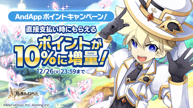 AndApp版「剣と魔法のログレス いにしえの女神」にて、直接支払いでお支払い頂くことで、通常1%のAndAppポイント付与が10%に増量!