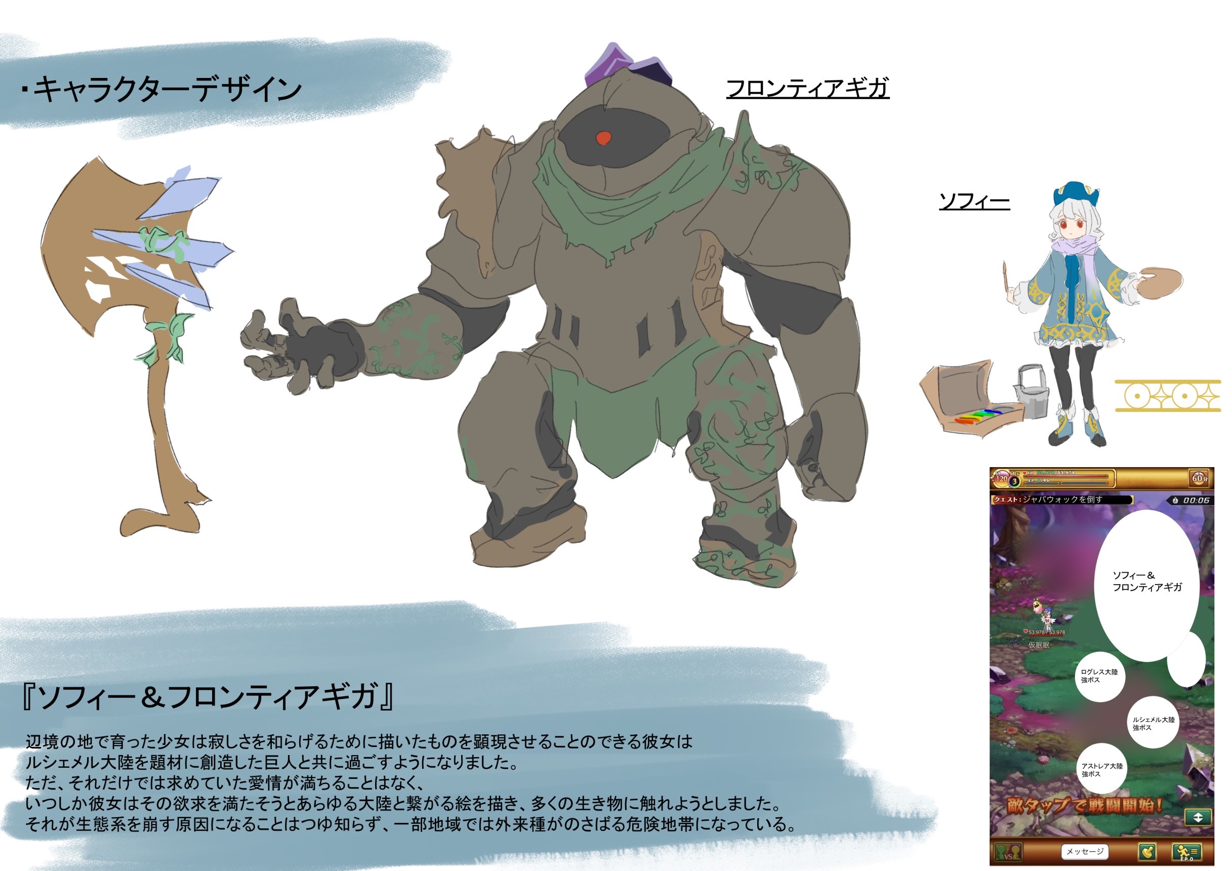 可愛いソフィーと頼もしそうでカッコいいフロンティアギガは、ログレスの世界観に溶け込むようなビジュアルで、世界の何処かにいてもおかしくないなと思えました。 千年樹の見える丘で絵を描いてるのかな・・・もしくはフロンティアギガの上でソフィーが寝てるのかな・・・とか想像してしまいます。 練られたバックストーリーと相まって説得力のある素晴らしいエネミーをありがとうございます! |