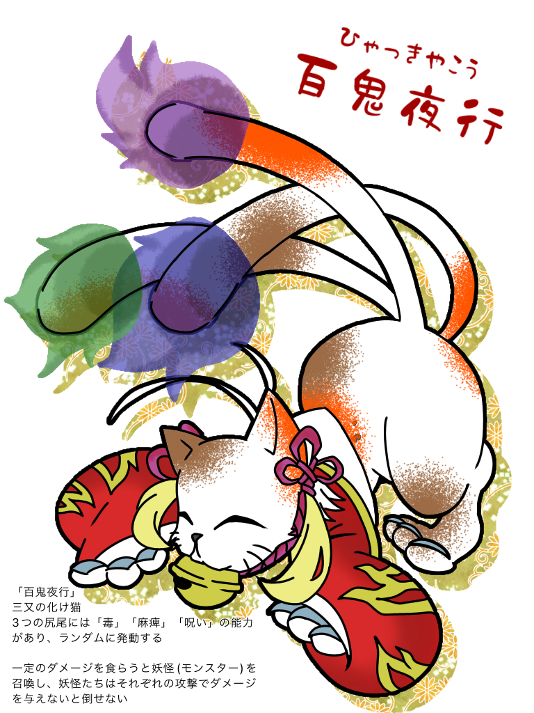 百鬼夜行というテーマを上手に落とし込んでいて、キャラクターとしても良いですね。 動いている姿が想像できる構図も魅力的です。 戦闘ギミックの設定も含めて、ログレスらしさが感じられる作品だと思います! |