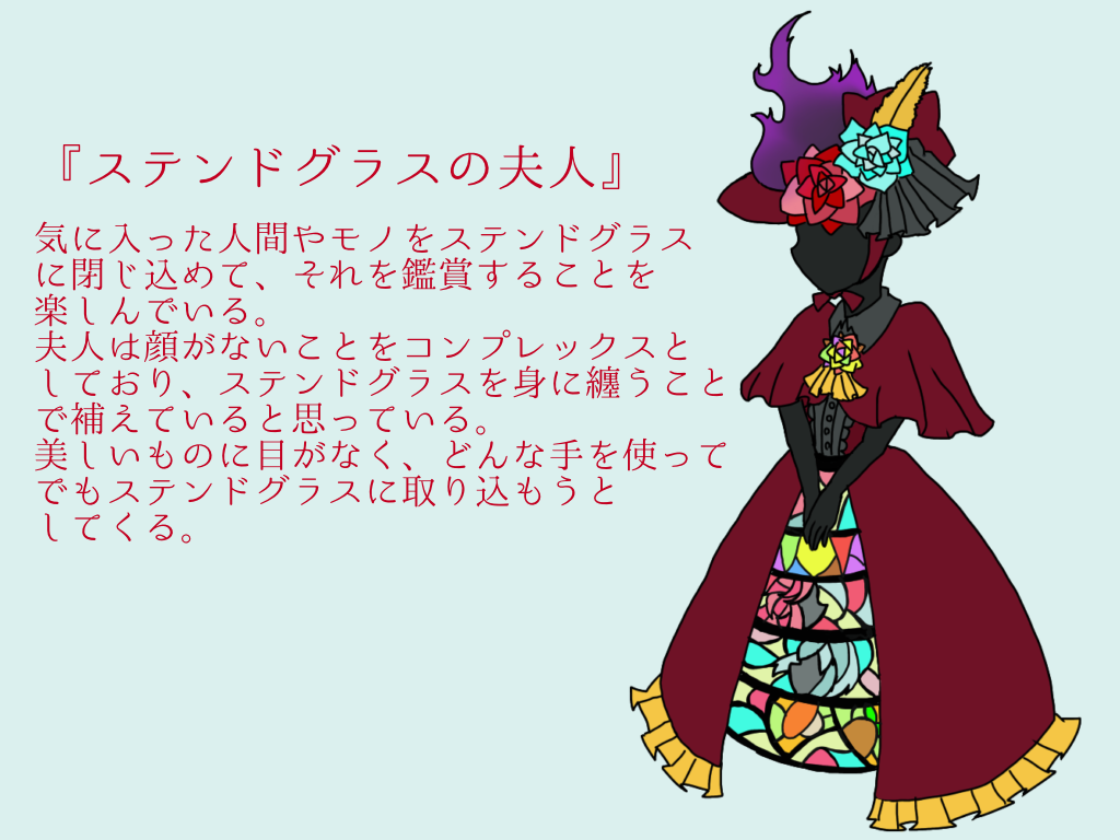 落ち着いた色のドレスに、ステンドグラスが色鮮やかで…はぅぅ…なんておしゃれ~~♡ 顔がなくてもとってもステキですよ。一緒におしゃれについて語り明かしましょう! |