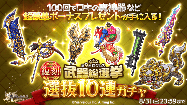 期間中、ガチャの「オススメ」タブにて「第9回ログレス武器総選挙」で上位120位までに選ばれた武器のみが手に入る「選抜10連ガチャ」を販売します。