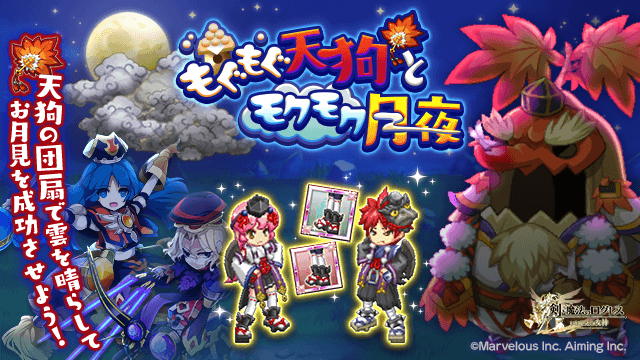 期間中、「ログレス」タブのスペシャルクエストおよび時限クエストにて、「もぐもぐ天狗とモクモク月夜」を開催します。
