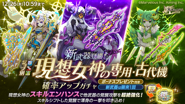 【12/4更新】新効果「スキルエンハンス」搭載の新武器「現想女神の専用武器・古代機」登場!