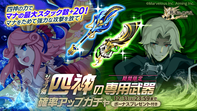 期間限定武器「霊刀青龍」「滅剣白虎」が、剣姫/リーフのジョブ別ガチャで確率アップ!